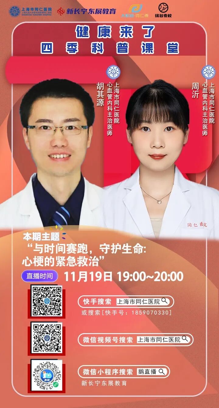 今天(11月19日)19:00—20:00,“上海长宁”App将与上海市同仁医院“大虹桥·同仁荟健康直播”共同直播:与时间赛跑,守护生命:心梗的紧急救治。