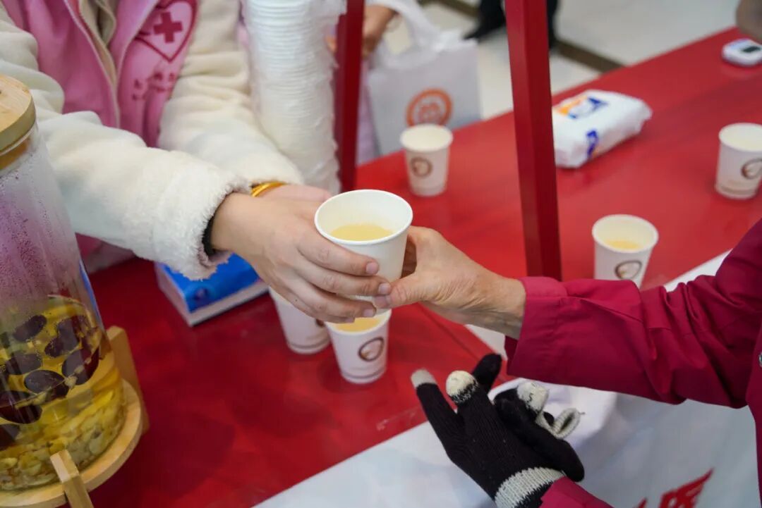 暖心饺宴开席的同时,大厅另一侧的公益市集也热闹了起来。吃完饺子的户外工作者们,纷纷走进市集享受专属健康服务。中医养生摊前,志愿者医生们为大家号脉问诊,并结合近期降温气候给出养生建议,还送上了温热的养生茶饮。