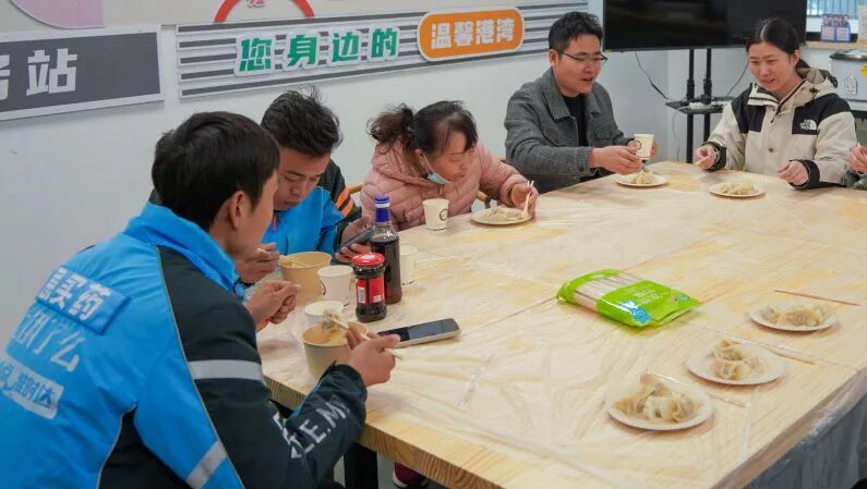 说笑间,第一批饺子陆陆续续地下锅了,沸水翻滚中,饺子浮起胀大,透着诱人的色泽。当志愿者把盛着热饺子的碗递到每个人手中时,大家都迫不及待地吹了吹,轻轻咬开一个小口。“真香!有家的味道,”小哥一边哈着气,一边连连点头。一旁的阿嬢给骑手碗里又添了几只水饺:“小伙子多吃点,降温了天儿凉,跑单费劲儿,多吃点才有力气!”一碗热饺子,陌生的彼此瞬间拉近了距离,筷子碰撞声、谈笑声交织在一起,成了冬日里最动人的声音。