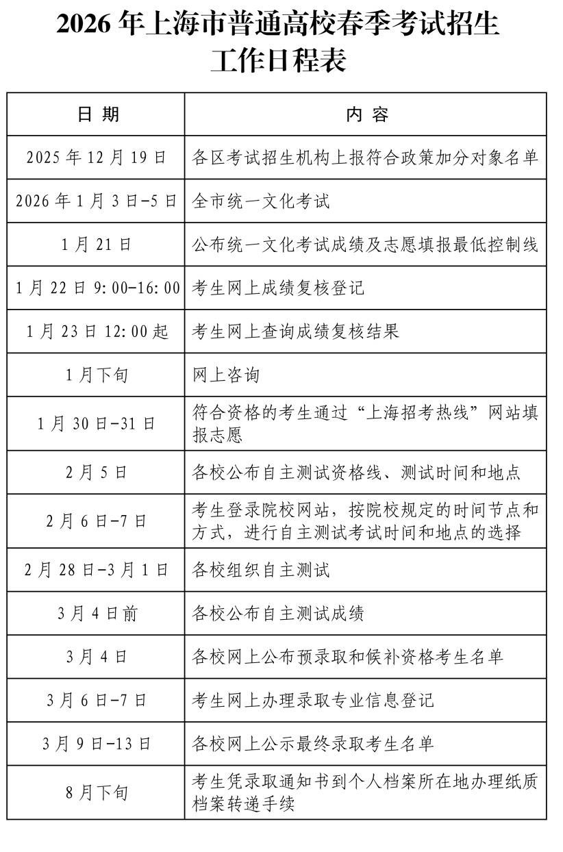 2026年3月9日-13日,招生院校公示最终录取考生名单,并完成录取工作。根据市教委规定,通过春季考试招生录取的考生(含列入候补录取资格名单并最终被录取的考生)不得参加《上海市教育委员会关于做好2026年上海市普通高校考试招生报名工作的通知》(沪教委学〔2025〕47号)规定的其他考试。