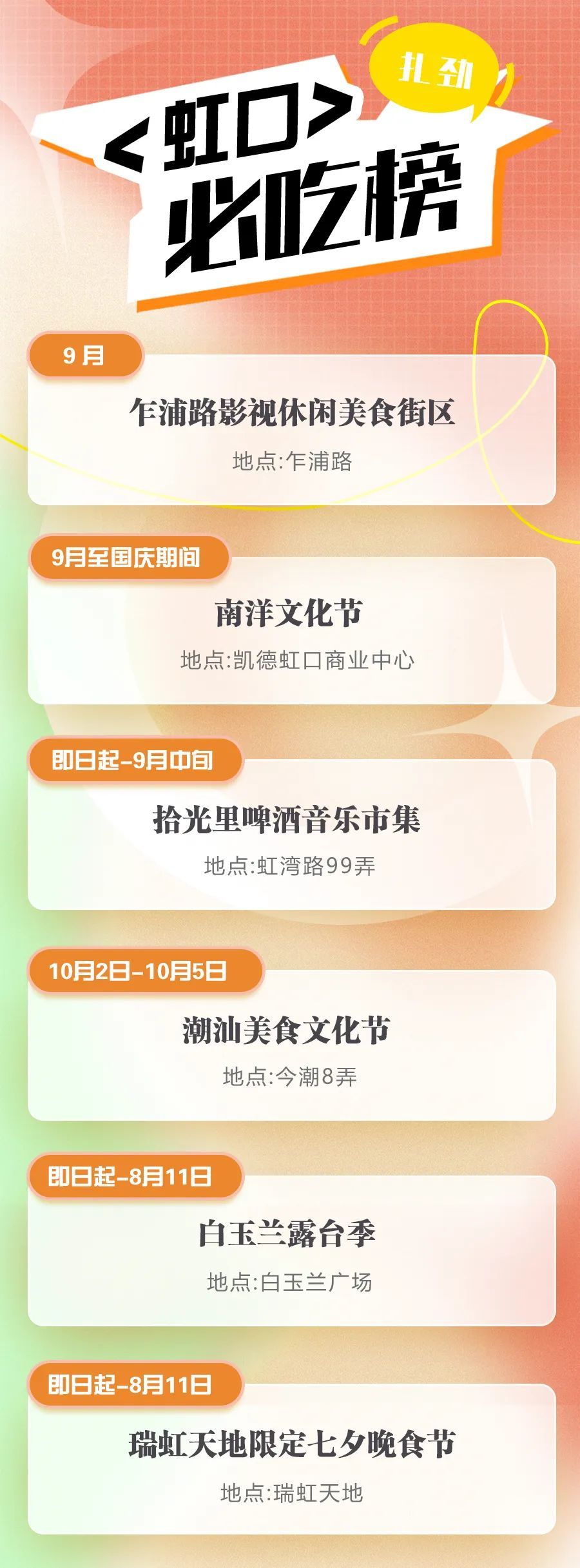 从推出“文韵商潮、体旅雅集”主题活动,每个季度定期发布“必看榜、必玩榜、必购榜、必吃榜、必练榜”5个Must榜单,到借势上海旅游节、“上海之夏”国际消费季、上海国际电影节、“五五购物节”等节点整合资源,虹口的每一步都紧扣“联动”二字。