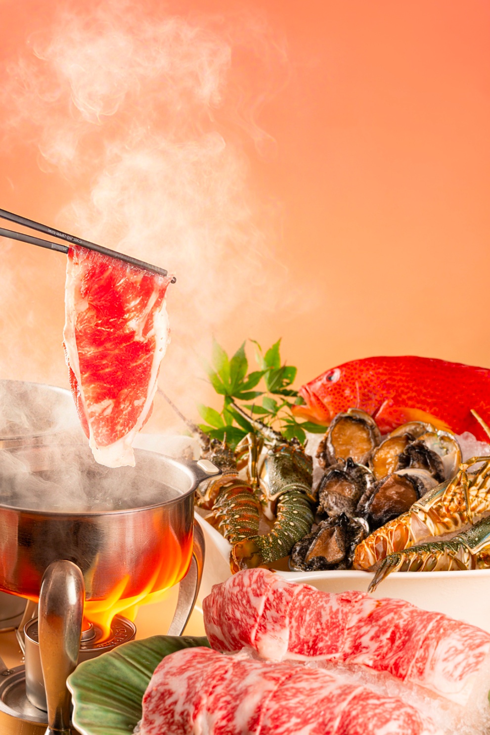 最适合冬日的火锅也可一键解锁——都会尚膳餐厅心意臻呈两款暖心锅底,五指毛桃锅清润香浓;日式寿喜锅以独特的调味组合赋予了锅底醇厚且层次分明的口感。食客们可随心搭配小青龙、鲍鱼、东星斑鱼片、精选和牛、新鲜菌菇时蔬等多种食材,在氤氲蒸汽中尽享暖意。