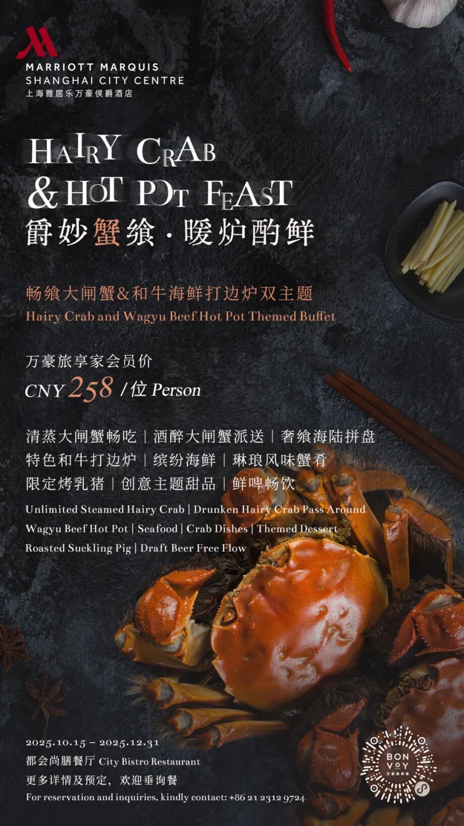 即日起至2025年12月31日,上海雅居乐万豪侯爵酒店都会尚膳餐厅以“鲜”入馔,甄呈“畅飨大闸蟹&和牛海鲜打边炉”双主题自助盛宴,邀食客们恣意奢享这场跨越山海、交织中西的味觉香诒之蕴,解锁至臻味蕾绮旅。