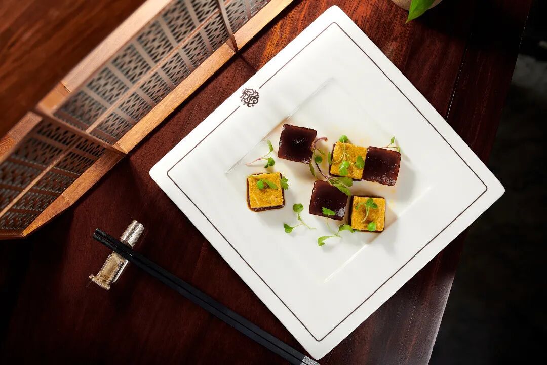 陈醋蟹粉鳕鱼冻清澈剔透,咸鲜味十足的鳕鱼冻中加入丝丝的手拆蟹粉,再以陈醋点缀提鲜,口感清爽,层次丰富。