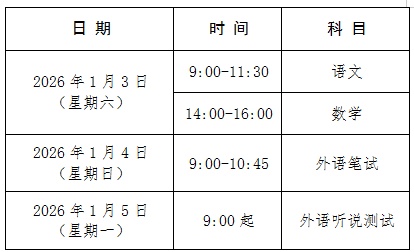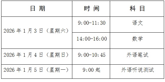 统一文化考试科目为语文、数学、外语三门科目,其中语文、数学、外语每科目总分150分。外语科目考试包括笔试和听说测试,笔试分值为115分,听说测试分值为35分,总分150分。考试时间如下: