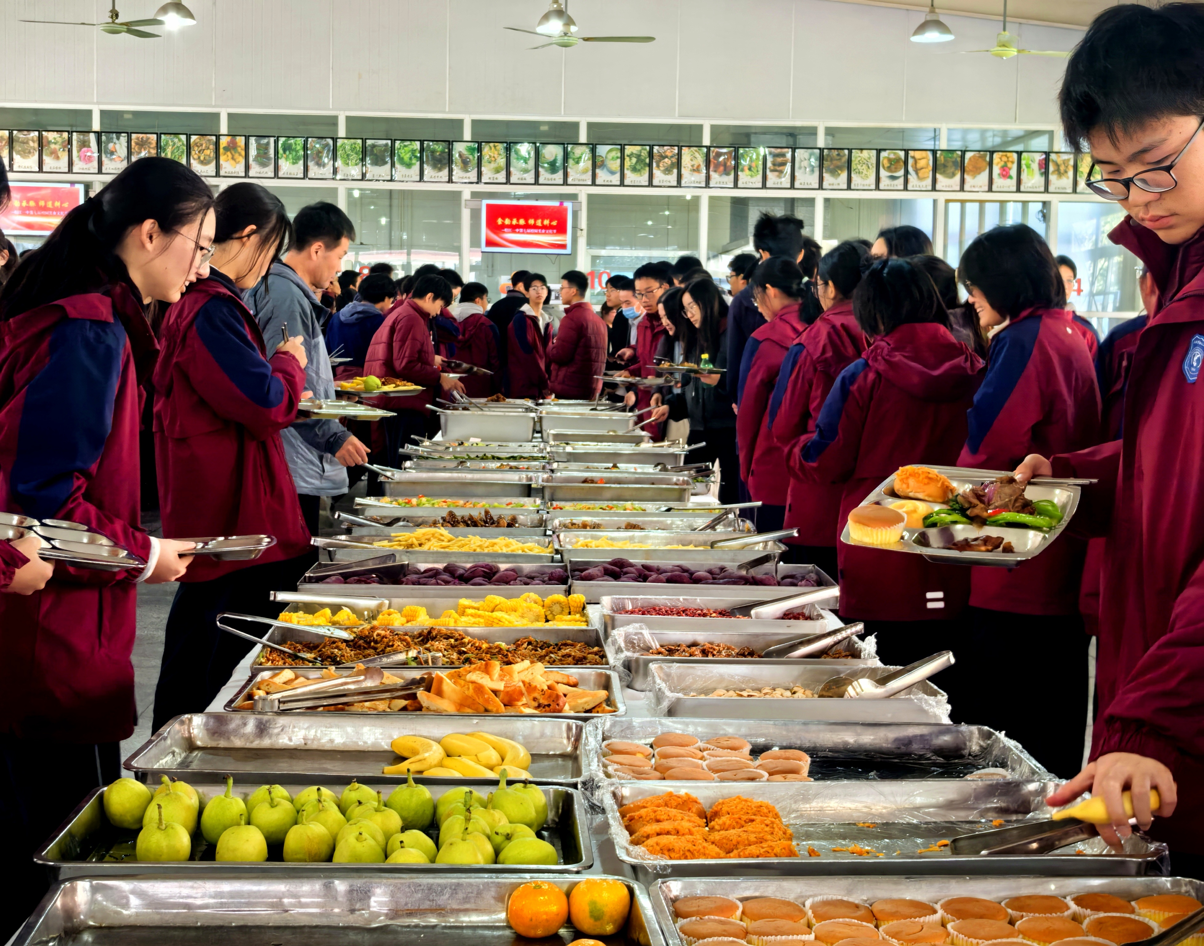 美食节当天,午餐开饭时间比平时早了许多,食堂内部的布置也和平时不太一样。十多张方形餐桌拼成长约十米的大长桌,几十种菜肴成排摆放。各班学生分批进入,自取美食。第一次过美食节,高一(1)班学生史曜瞳兴奋地说:“菜品太丰富了,味道也很赞,感谢食堂的叔叔阿姨辛苦备餐!”同班同学韩若瑶还特地带了相机记录。
