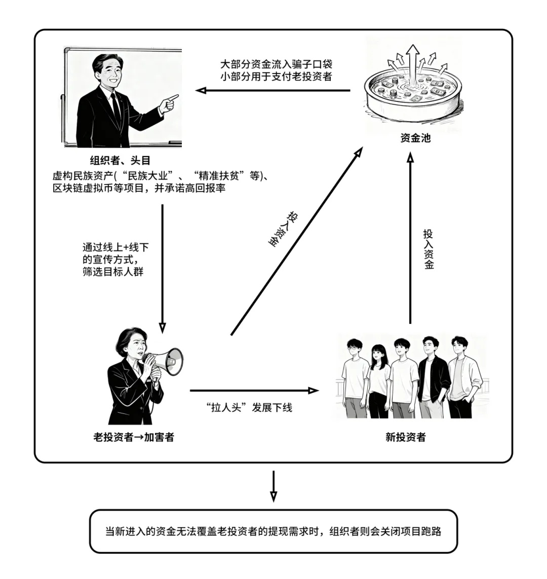 组织团伙往往打着国家、民族的旗号,通过伪造国家机关公文、证件、印章,编造国家相关政策等非法手段,虚构各类 “投资项目”,如“历史民族资产”“乡村振兴”“精准扶贫”“惠民生国债”,或是打着“区块链虚拟货币”旗号的项目,宣称 “免费挖矿”,无需实际操作即可通过“算力增值”“币价上涨”获利。