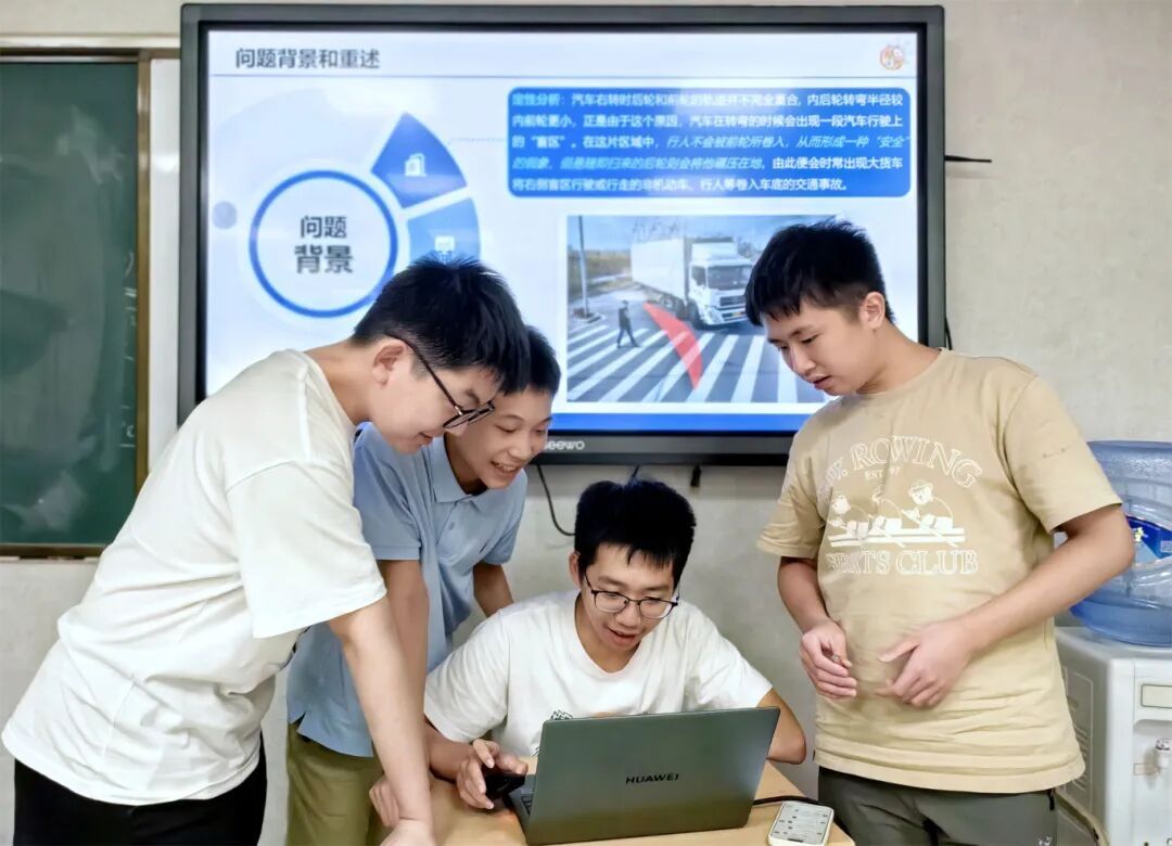 《基于刚体运动学的车辆右转盲区研究》是面向高中生的数学建模课题,对于初中生而言,有诸多知识盲区。面对难题,四位同学迎难而上,挑战未知领域。暑假期间,他们查阅了大量的科技文献,为了提高效率,他们分头行动,每个人把各自负责的知识点做成简明易懂的课件,定期通过视频会议分享给其他小伙伴。在后期的建模阶段,他们连续一周每天相约在一起,每人一台电脑、一块白板,从白天到黑夜,不间断地讨论、制图、撰写论文,修改、再讨论、再修改,在短时间内完成了解决课题所需知识的学习,最终一致达成建模解题思路和方案,共同完成了长达30多页的论文撰写。