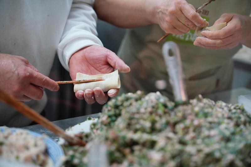盛兴馄饨的精妙之处,全藏在细节里。蔡师傅指着案板上的馅料,认真地介绍道:“这馅料,不管是猪肉,还是荠菜、青菜,都必须要当天最新鲜的。猪肉得选七分瘦三分肥的,肉馅要能看得见肉粒,但吃起来还不能柴;荠菜一定要选带根的鲜货,焯水后挤水这一步,非常关键,水挤多了,荠菜就柴了,水挤少了,馅料又太湿了。”而最关键的包法,盛兴也有着自己的讲究——要捏成“元宝”形状,三道褶严丝合缝,这样才能锁牢汤汁。这份师徒代代相传的手艺,就在一剁一捏之间,延续了一代又一代。