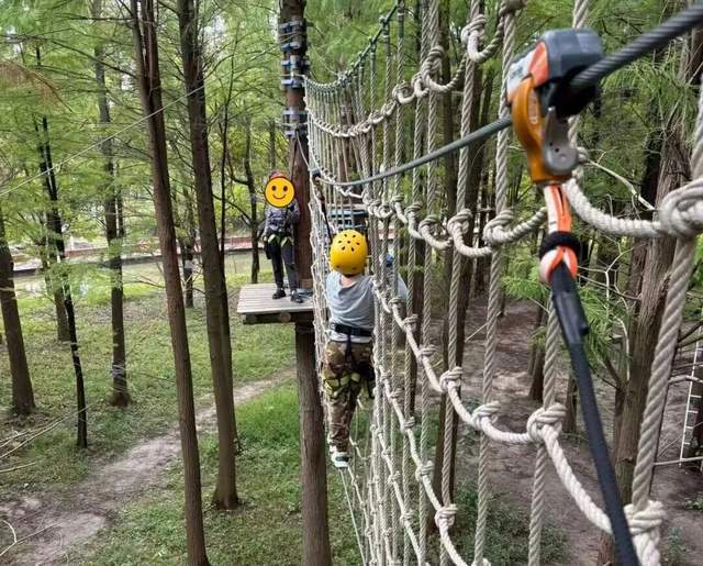 林间不时传来孩子们的声音——有紧张时的呼救“妈妈,救我!”,有焦急时的念叨“别晃了,要掉下去了”,更有突破后的欢呼 “我终于过来了!”“原来树木能帮我们挡住风沙呀!”汗水混着笑声,孩子们在挑战与突破中变得更笃定,也在心底埋下“气候担当”的种子。