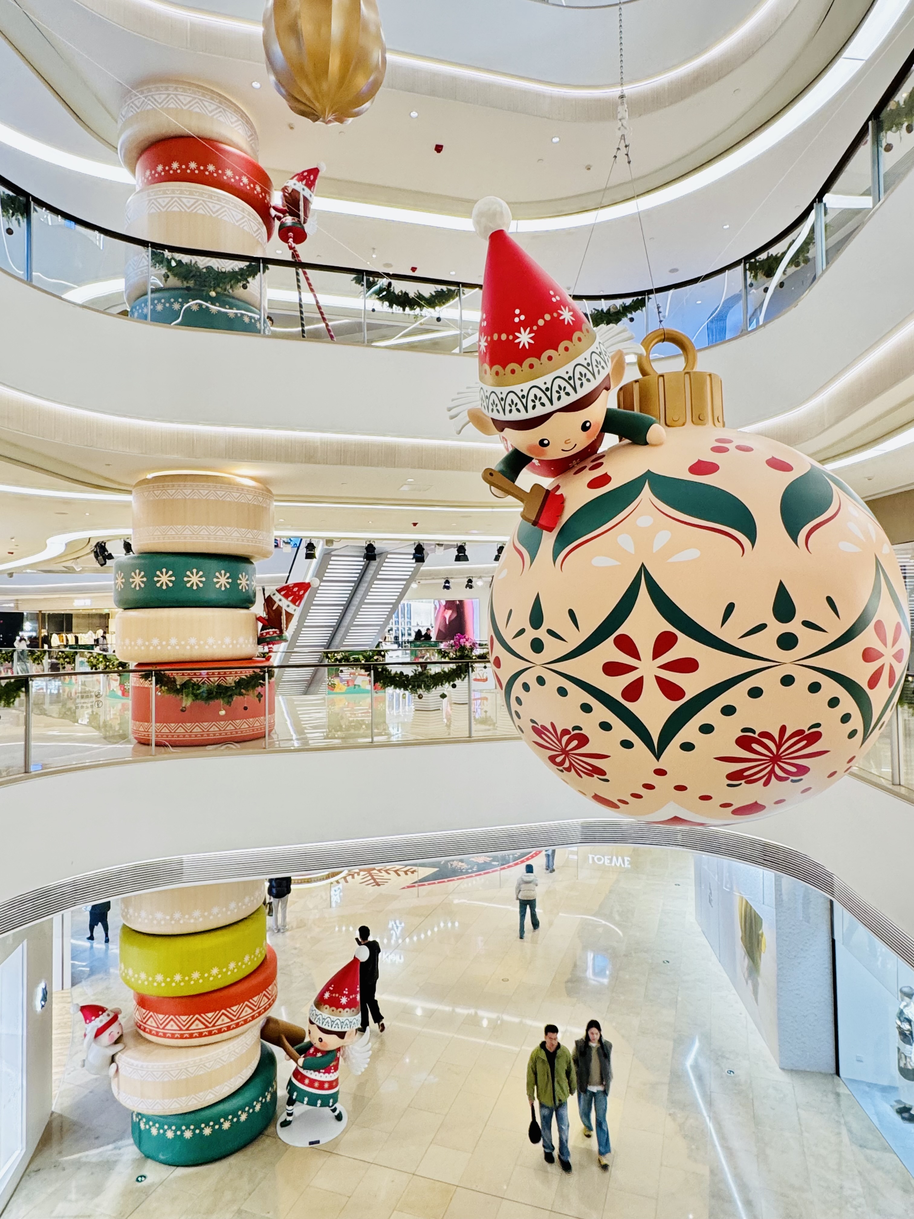 贯穿L1至L4的中庭通天柱,还原了北欧传统的积木玩具“敲敲塔”,串联起垂直空间的节日韵律,进一步推动节日氛围在全场流动。