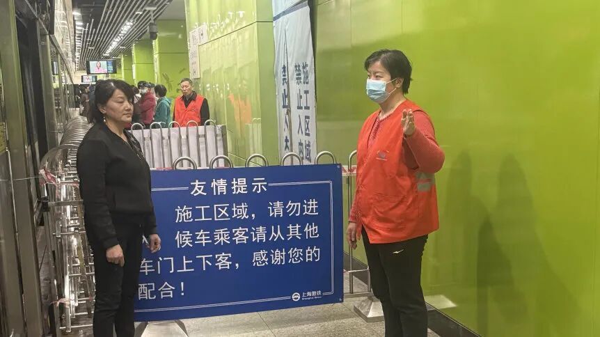 物理防护精准引导,规避安全风险施工期间,车站一方面通过设置铁马围栏与安排驻点人员,实现了施工区域的物理隔离与秩序维护。另一方面,更为关键的是,考虑到施工站台门分阶段停用,车站采取了前置引导服务,即提前安排增岗人员在三门路站上车,在暂停使用的站台门所对应的列车车门处,通过口头提示、手势引导等方式向乘客明确“此门不下客”,并有序引导到站乘客从两侧相邻车门上下车,有效避免了乘客因不知情导致的等待延误。