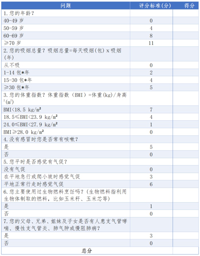 怎么初步判断自己是否容易患慢阻肺病呢?我们可以通过下面简单的7道题小测试初步判断。如果分数≥16分,就说明患病风险比较高,需要去医院做更准确的肺功能检查来进一步确认。