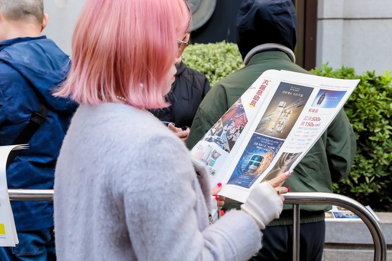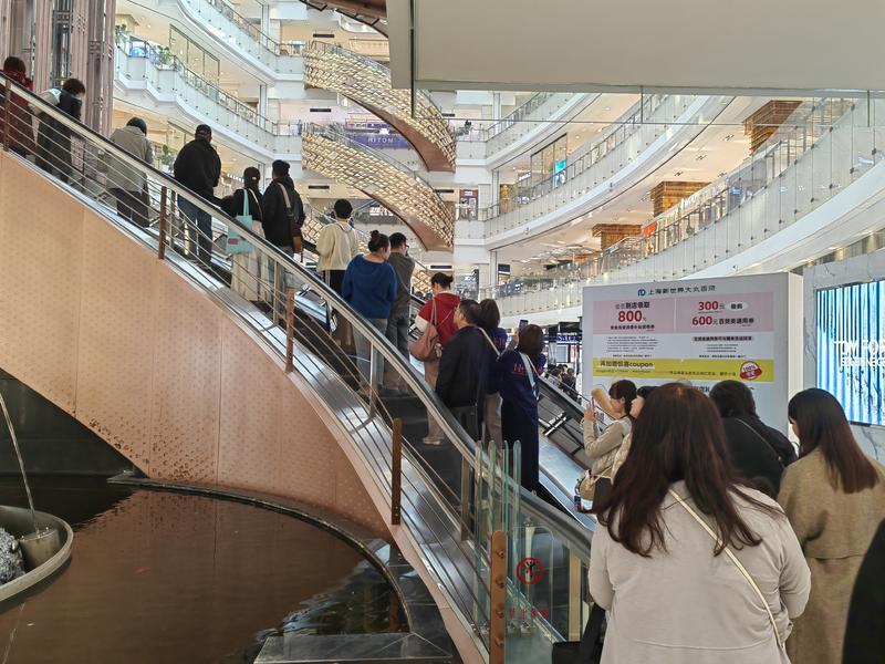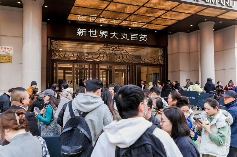 上午9点不到,商场门口已大排长龙。有趣的是,以大丸南京路店门为分界点,队伍被一分为二:一条是排“100会员积分+299元换购600元百货类通用券”,另一条则排满8000元减800元黄金补贴券。