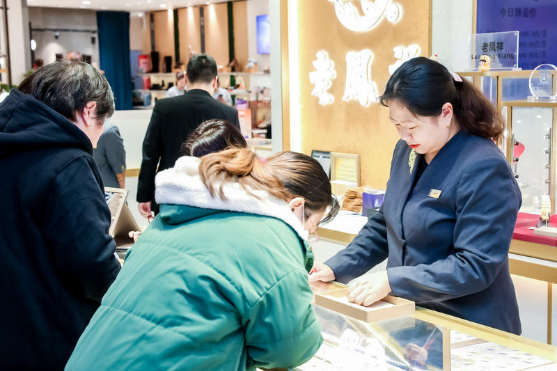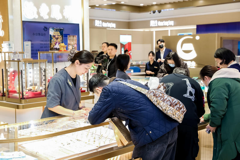 黄金柜台也是“人气宝地。”不少品牌方推出了自己的折扣活动,比如老凤祥,金饰品每克能减130元,还能叠加商场8000—800元券。即将结婚的李先生当天就带着妻子来挑选心仪产品。“买婚金是刚需,今天我们一人抢了一张券,还是蛮划算的。”
