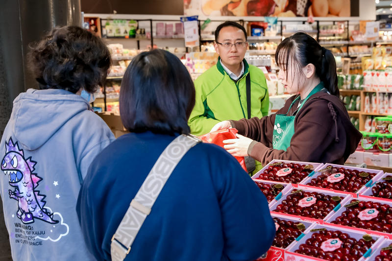 在B2楼的OLE超市,99元1kg的智利车厘子吸引了不少消费者。“刚刚上市,很新鲜,外面要100元一斤,这里能买两斤,超级划算的。”