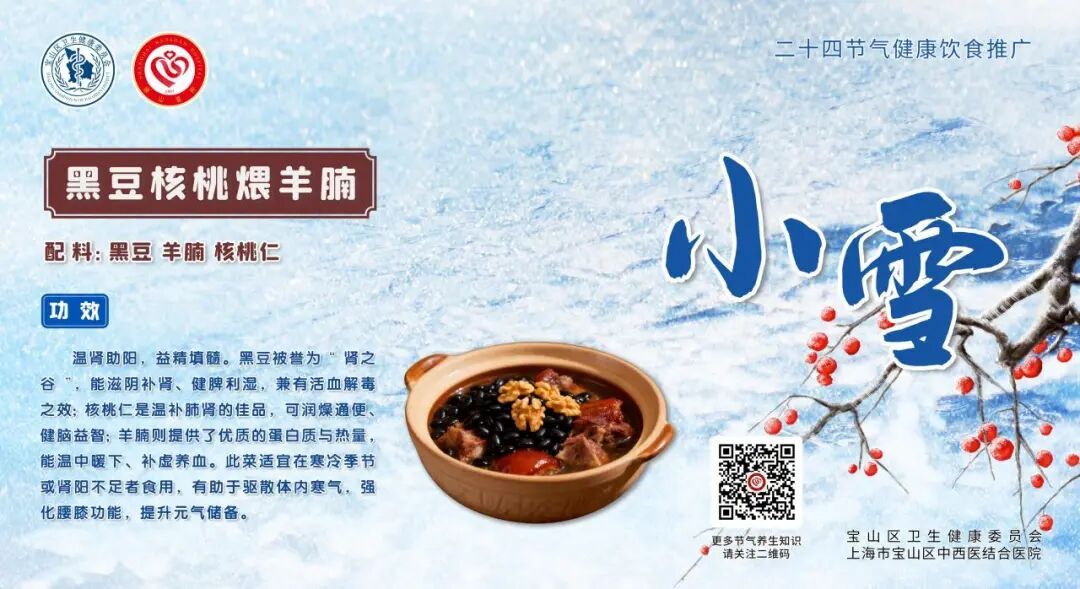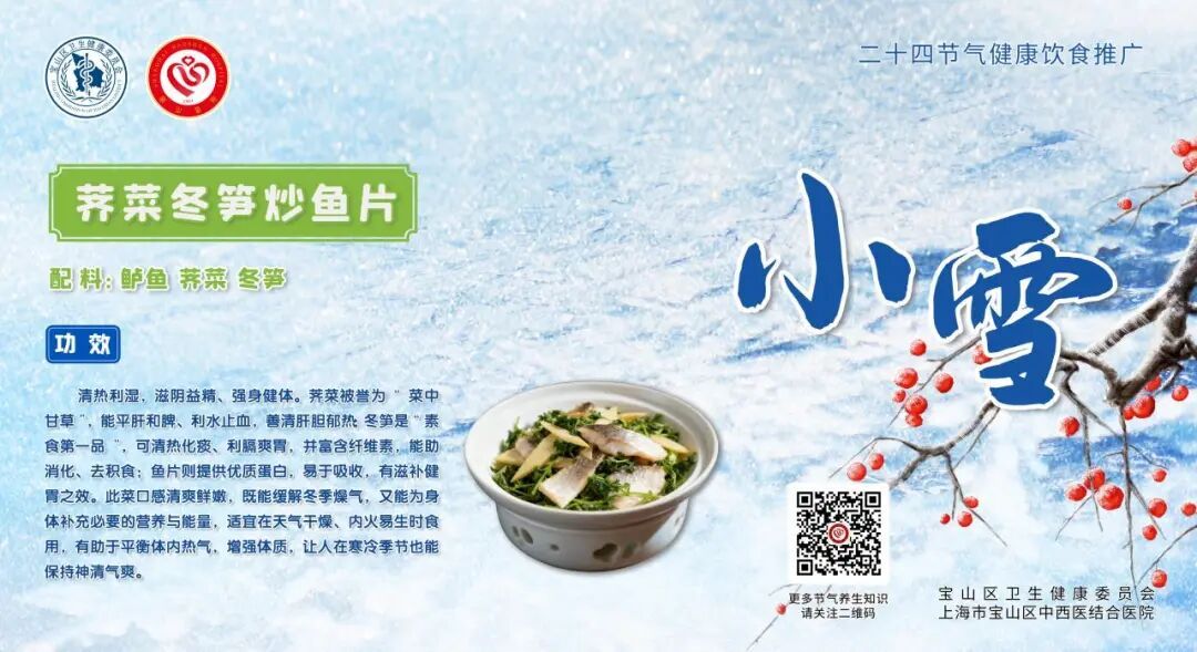 小雪至·冬安暖 为积极践行国家卫健委“二十四节气养生与健康”理念,深度响应宝山区卫健委“健康四季——二十四节气话健康”特色科普品牌,宝山医院依托中西医结合专业优势,组织资深医师与营养师团队,将节气养生智慧与现代营养学深度融合,重磅推出二十四节气系列健康养生膳食。 本次聚焦小雪时节,特别推出“温中补虚·防寒润燥”系列,精选时令食材,匠心打造荠菜冬笋炒鱼片、蒜苗豆干炒腊肉、黑豆核桃煨羊腩、桂枣姜米茶、枣泥山药糕等时令美馔,为您带来味蕾与身心的双重抚慰。针对小雪“寒气渐盛、燥邪未尽”的气候特点,助您温阳驱寒、固本培元,为身体积蓄能量,安稳迎接凛冽寒冬。