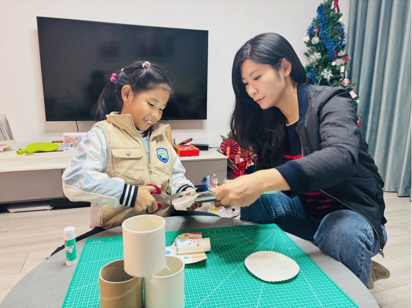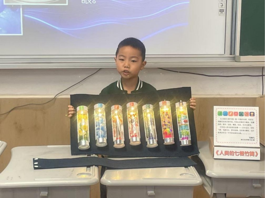 比赛中,每组亲子家庭各显神通,用创意与巧思诠释对主题的理解。徐汇区长桥第三幼儿园马奇凡家庭参加了“AI解码·文物原型实验室”赛题,带来了极具奇思妙想的作品“人类的七根竹简”。围绕孩子最先提出的“如何给未来的人看现在的东西”这一疑问,以“竹简”为载体,通过自然、海洋、动物、情感、科技、艺术和梦想代表地球七种力量的象征表达,将废旧物品赋予新的生命。“爸爸负责裁切打磨,妈妈帮着定颜色和安装,我们一起画符号、思考每根竹简里的内容。”马奇凡介绍自己作品制作的过程,首先把纸筒包上锡纸,再把中间裁开装上塑料片,又在每一根竹简里放上七种力量的代表物。整个过程像开了个家庭小工厂,从剪纸、上色到粘合,桌上满是颜料、碎纸,最后在欢声笑语的创作中完成了这次跨越古今的“亲子探险”。