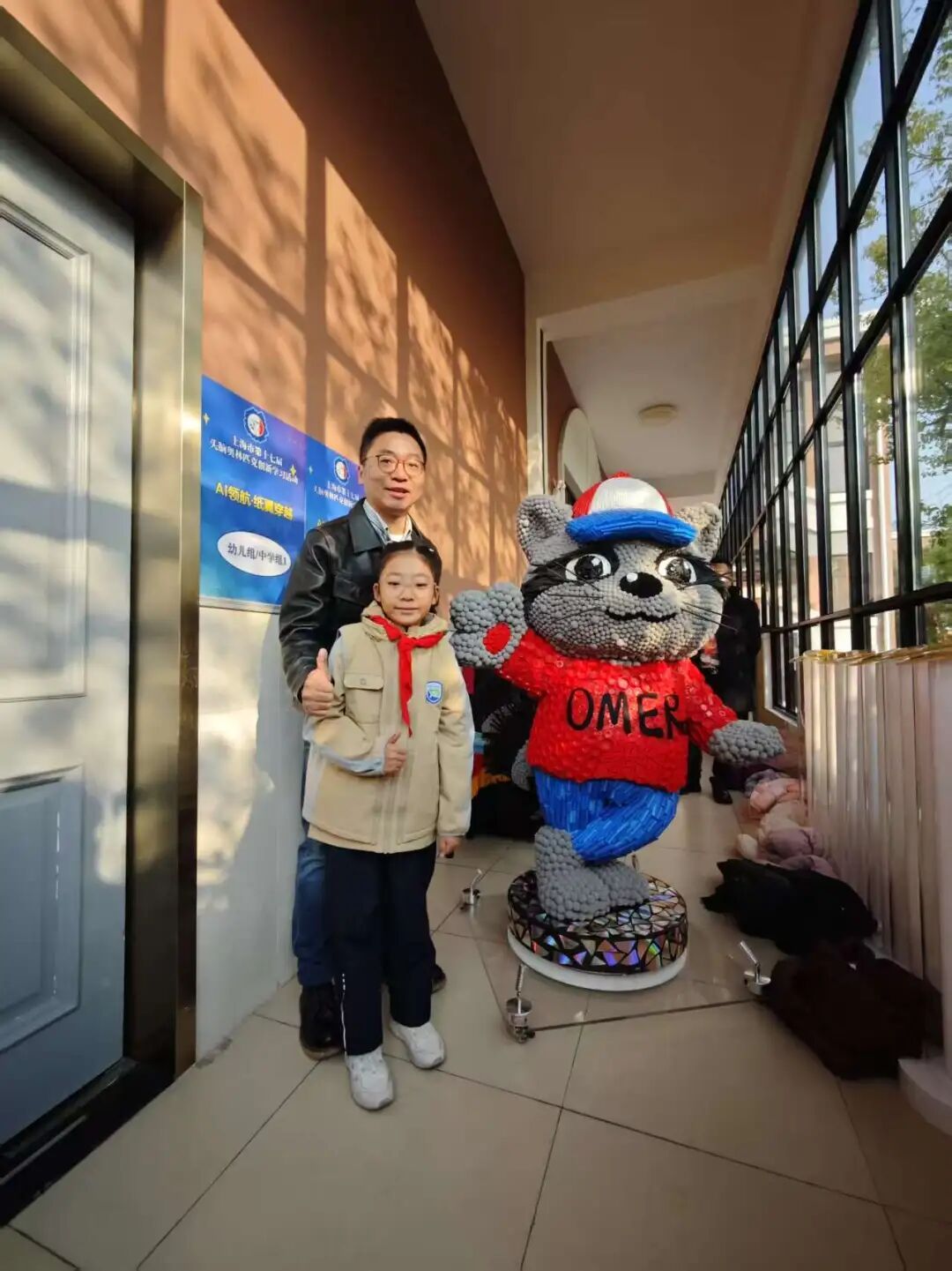 在决赛开幕式上,新普陀小学东校的顾伊昕家庭制作了一个活动吉祥物“OMER雕塑”作为开幕式启动装置。这件装置是由废弃纸箱、泡沫等常见废旧材料,通过切割、拼贴塑造出OMER的立体骨骼形态。在此基础上,斑斓的颜料为OMER雕塑赋予鲜活色彩,而最令人称奇的是其独一无二的“创意外衣”——利用彩色吸管、纽扣、瓶盖等日常生活中易被忽略的材料,经过奇思妙想的重新组合,最终使得每一件材料都带着过往的故事完成了“新生”。据介绍,这件雕塑不仅是吉祥物OMER的具象化呈现,更是将环保理念融入趣味创造之中,鼓励我们用发现的眼光看待身边事物,用创新的思维去做一些改变、用双手实践可持续发展的理念。