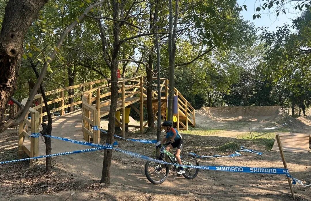 在Park Cycling小镇里,参赛选手精神抖擞、整装待发。随着鸣笛声,大家如离弦之箭冲出起点。此次赛道全长4.5公里,其中新增的木栈道赛段蜿蜒于林间,全长约300米,为选手带来全新体验。