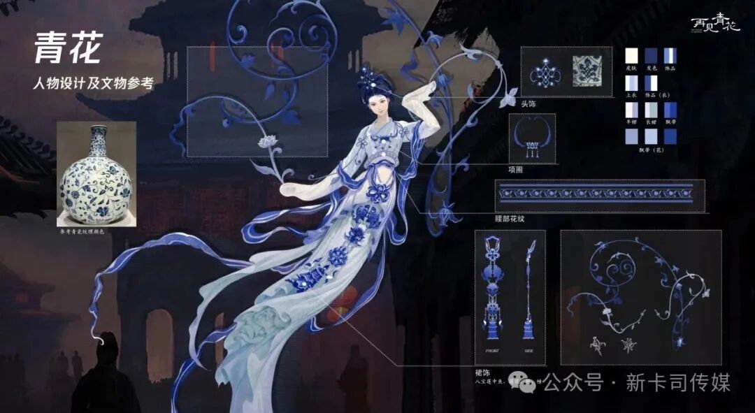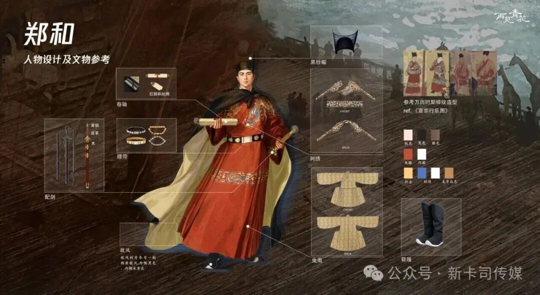 角色塑造上,国风笔触勾勒东方神韵。传统笔触与现代审美碰撞,让《再见青花》的每个角色都成为流动的中式美学符号。拟人化IP小青花的服装对照永乐青花的器物纹样及明代女性的发髻鞋履,将其生动活泼形象展现出来,郑和头戴明代独有的三山帽,身着绣蟒龙纹朝袍,举手投足尽显明代的坚毅风骨。