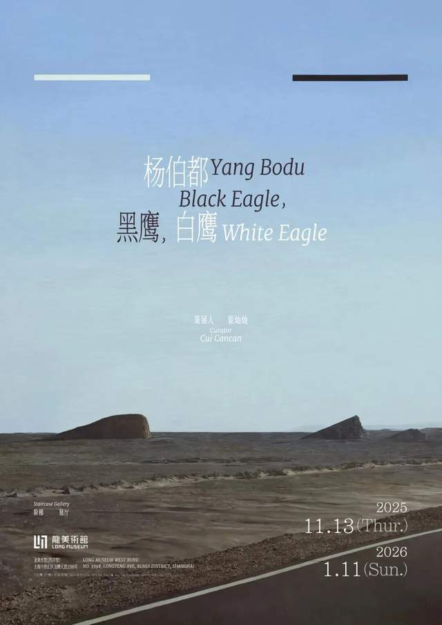 龙美术馆(西岸馆)又上新了!“杨伯都:黑鹰,白鹰”根据美术馆空间量身打造了“洞穴水潭”概念——以黑色砂砾营造水潭意境,逐级深入、洞穴式的阶梯展厅,令观众仿佛游走于充满神秘感的丛林之中。