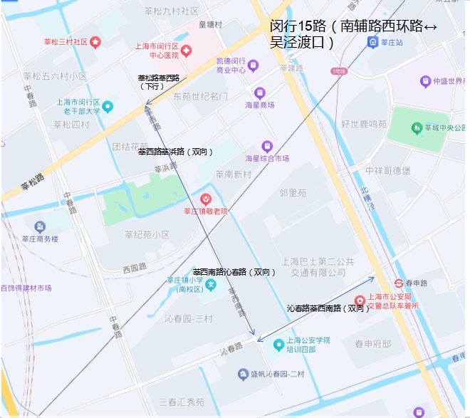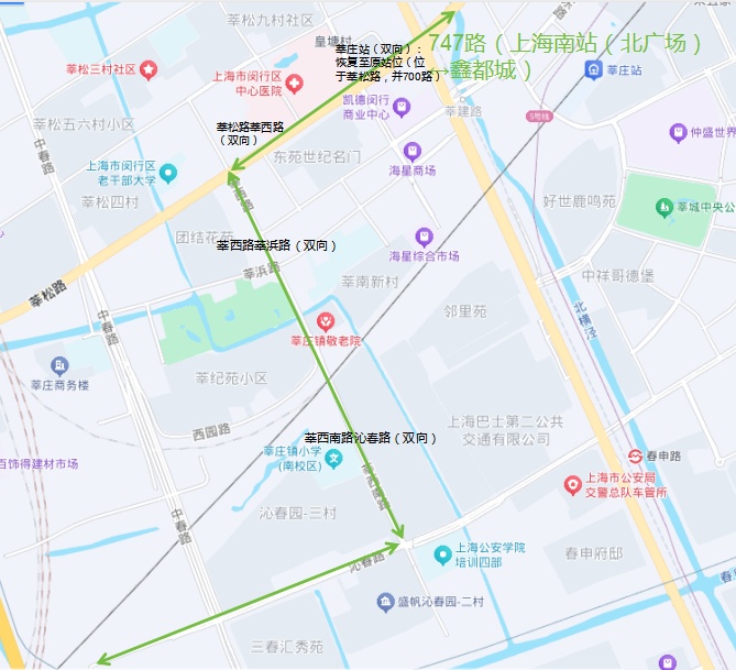 恢复线路站点:沁春路莘西南路(双向)、莘西南路沁春路(双向)、莘西路莘浜路(双向)、莘松路莘西路(下行) 撤销临时增设站点:二汽莘庄场(双向)、莘庄(下行) 闵行15路恢复站点图 恢复站点:莘松路莘西路(双向)、莘西路莘浜路(双向)、莘西南路沁春路(双向) 莘庄站(双向):恢复至原站位(位于莘松路,并700路) 撤销临时增设站点:二汽莘庄场(双向) 747路恢复站点图