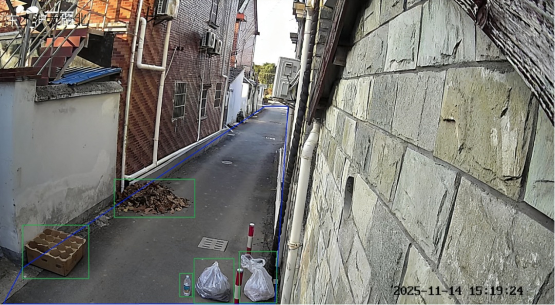 全域覆盖,一“屏”了然。系统实现对全村公共区域的24小时智能巡护,自动识别、抓拍小包垃圾违规落地行为,并实时推送告警信息与精准定位。