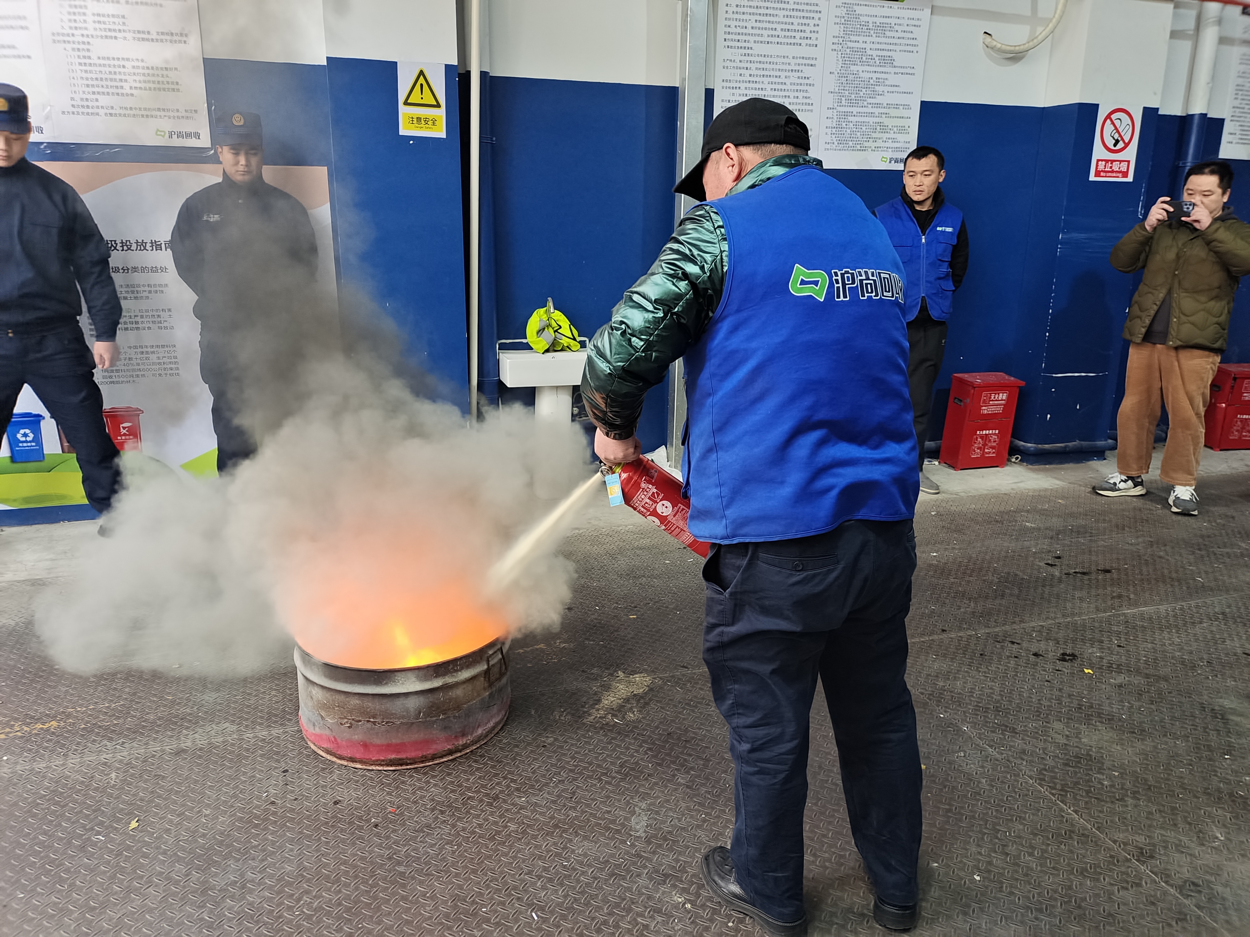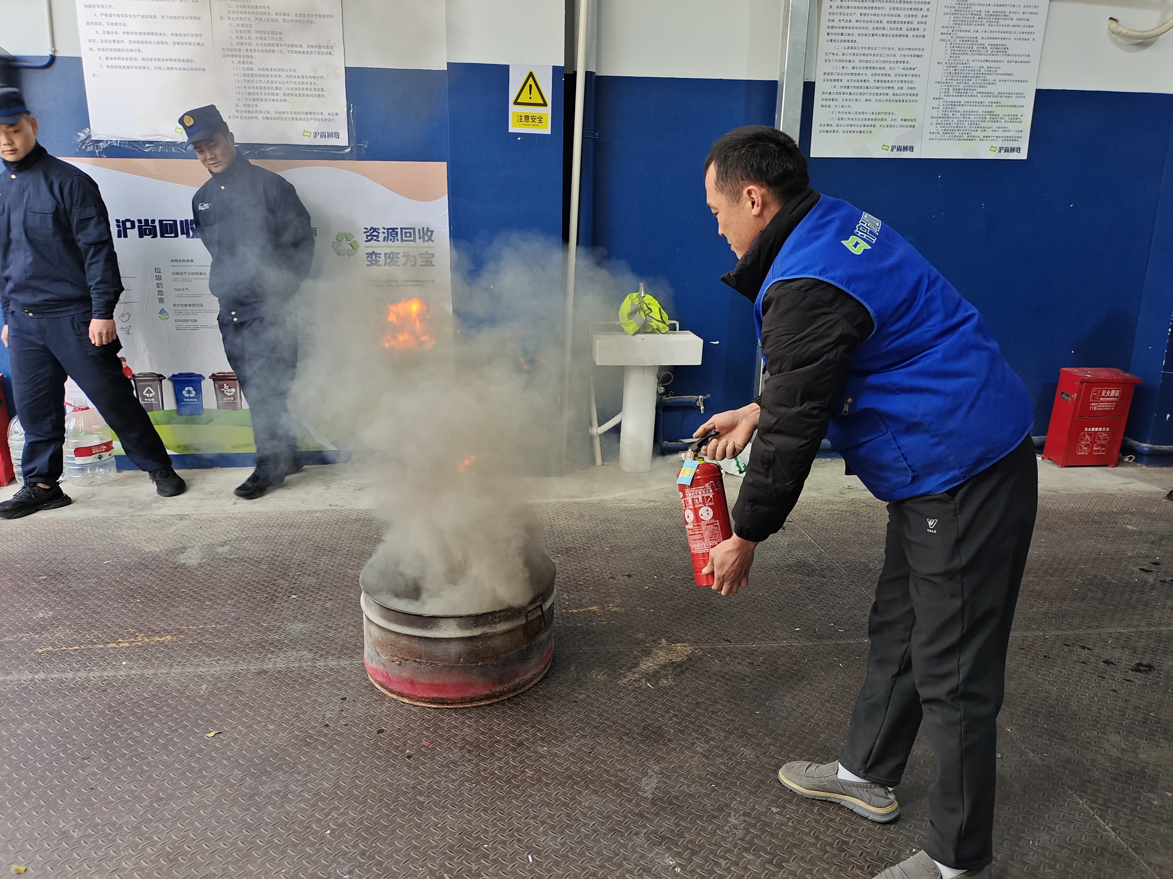 随后,消防员带队对可回收中转站进行安全隐患排查:逐一检查喷淋系统的压力与完好性、核对灭火器有效期及检查记录,针对中转站内物资堆放密集的特点,重点叮嘱“保持消防通道畅通、规范用电用火”的日常管理要求,把隐患排查的“细节标尺”传递给每一位工作人员。