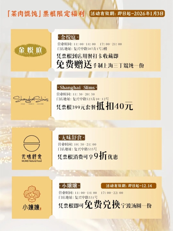 即日起至 2026 年1月3日(周六),凡在思南公馆当日单笔消费满200元,凭该笔当日消费小票,即可领取「菜肉馄饨主题随机文创」1份(礼品款式随机,不可指定)。