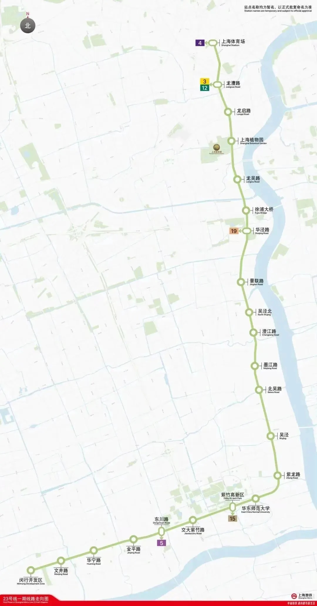 23号线一期工程自闵行开发区站至上海体育场站,线路全长约28.6公里,共设22座车站,串联了闵行开发区、紫竹高新区、吴泾转型区、徐汇滨江等重要区域。该线对加强老闵行至市区之间的轨道交通服务,带动浦西南部区域发展具有重要意义。