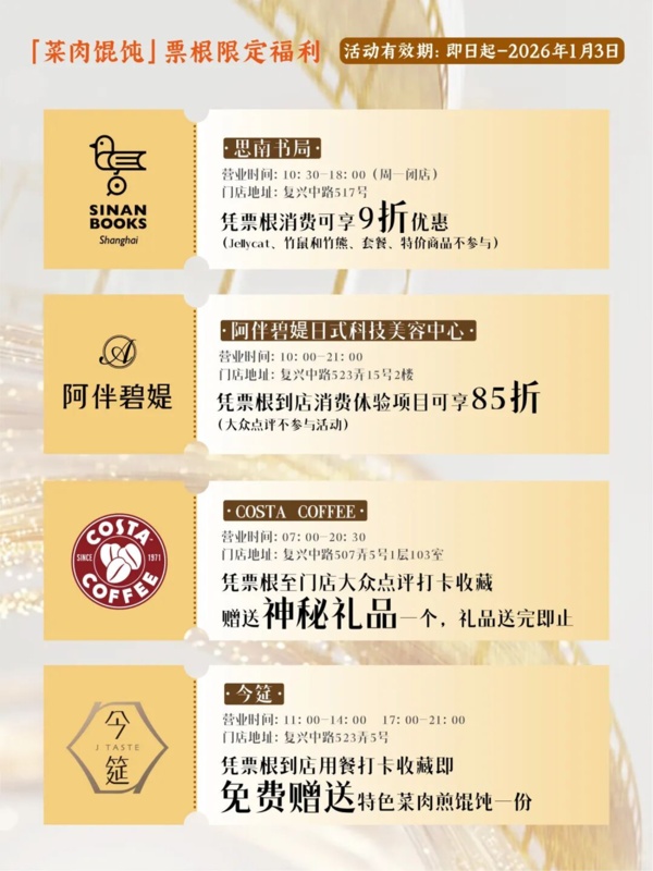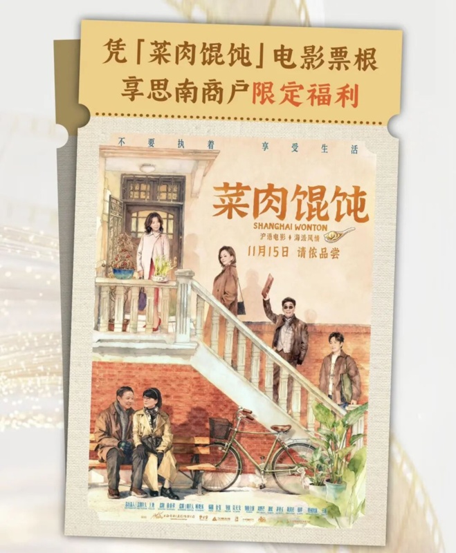 打卡完会客厅,手里的《菜肉馄饨》电影票根别着急扔!我们还准备了「电影票根优惠联动」—— 凭票根到会客厅周边合作店铺,就能享受专属福利,逛吃逛玩更划算~
