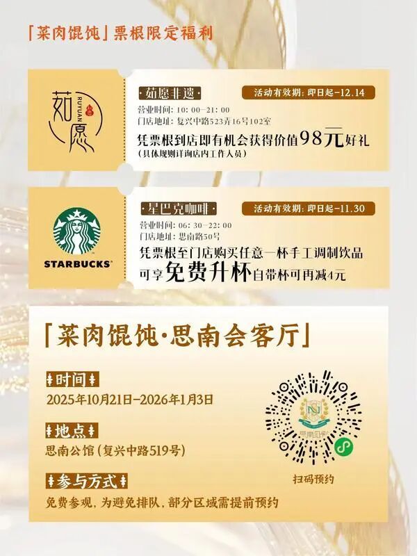 “菜肉馄饨・思南会客厅”自开放以来,便成了上海梧桐树下的“烟火打卡地”——无论是电影《菜肉馄饨》的影迷追寻同款场景,还是朋友们感受老上海弄堂风情,这里都承载了太多温暖与喜爱。为了让这份烟火气延续更久,菜肉馄饨・思南会客厅开放时间正式延期至2026年1月3日!更有全新主题限定文创“满赠上线”、持续不断的大咖活动,这份「馄饨味」的快乐,还能陪你好久!