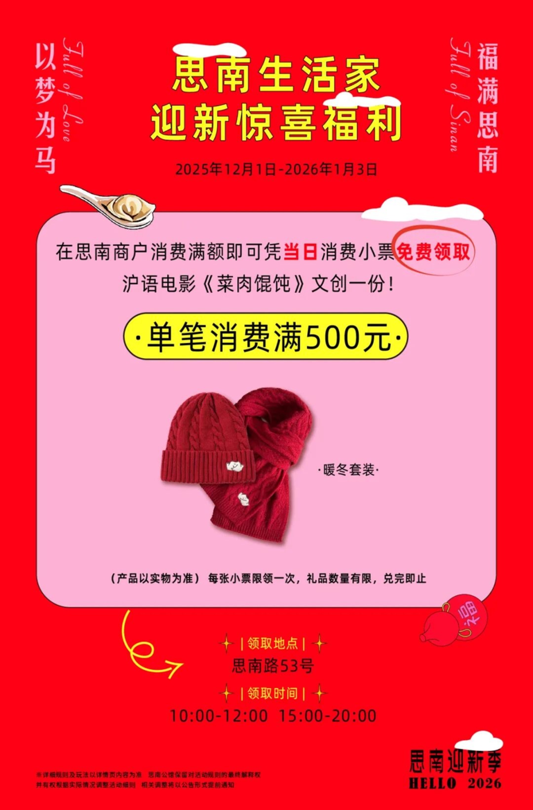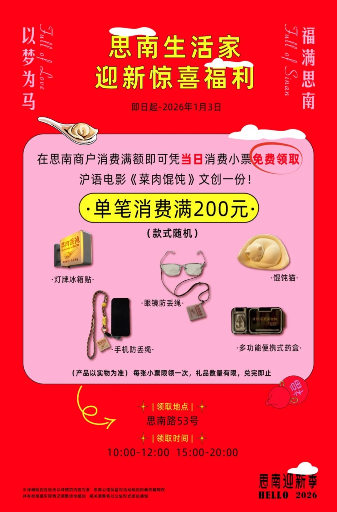 即日起至2026年1月3日(周六),凡在思南公馆当日单笔消费满200元,凭该笔当日消费小票,即可领取「菜肉馄饨主题随机文创」1份(礼品款式随机,不可指定)。