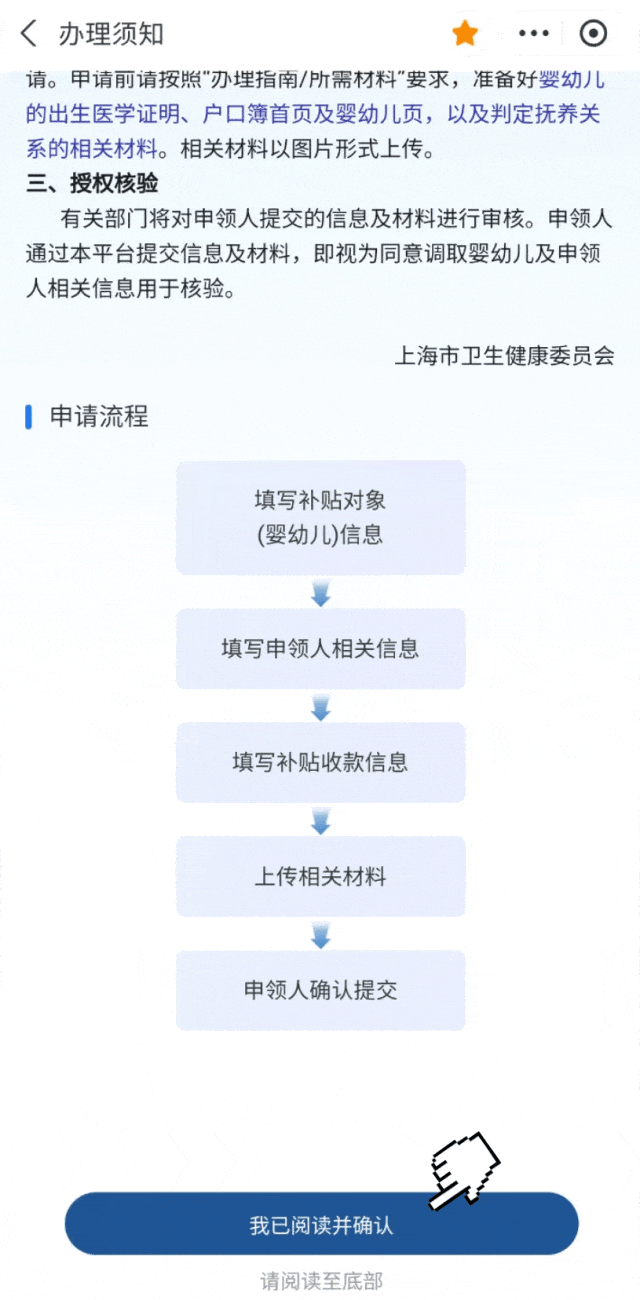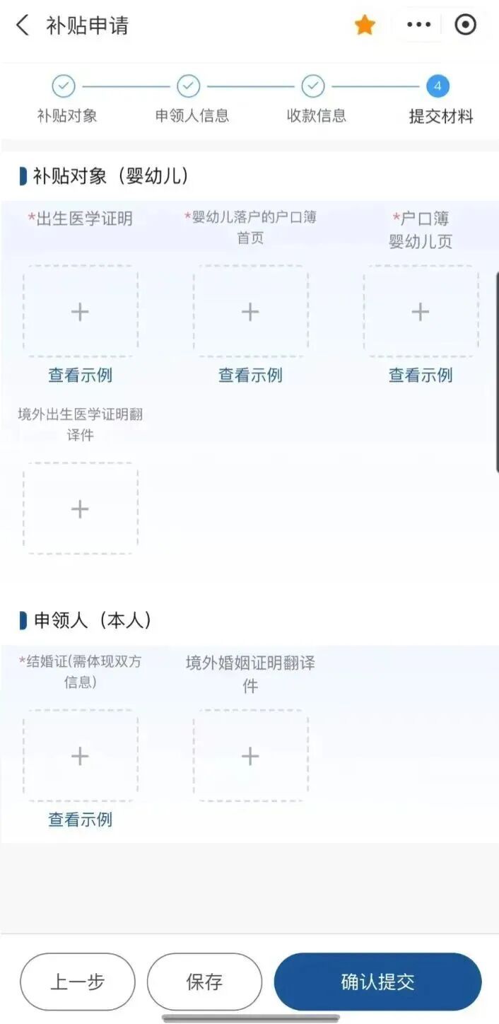 7.按页面提示上传婴幼儿(补贴对象)的出生医学证明、户口薄首页及婴幼儿页,以及判定抚养关系的相关材料,确认提交后等待审核结果。