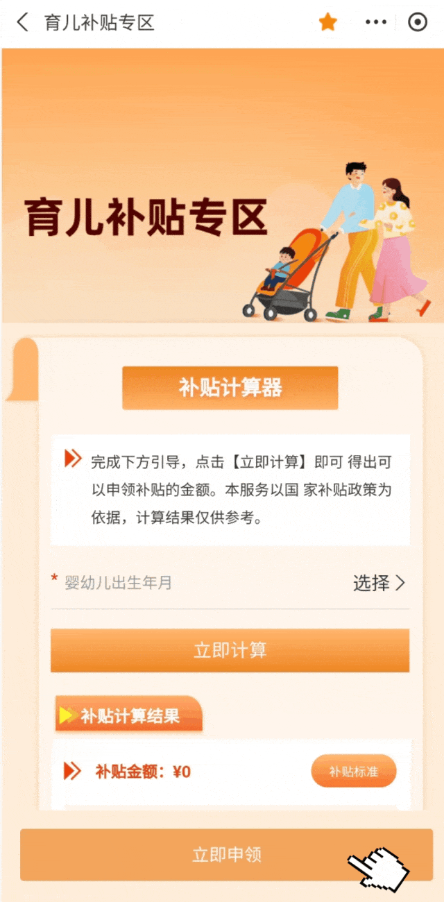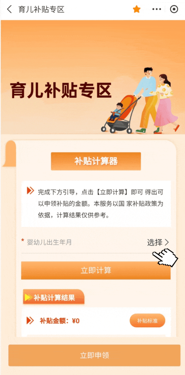 进入专区页面后,输入宝宝的出生年月,即可通过“补贴计算器”快速计算补贴金额,还可一键查看相关补贴政策标准。