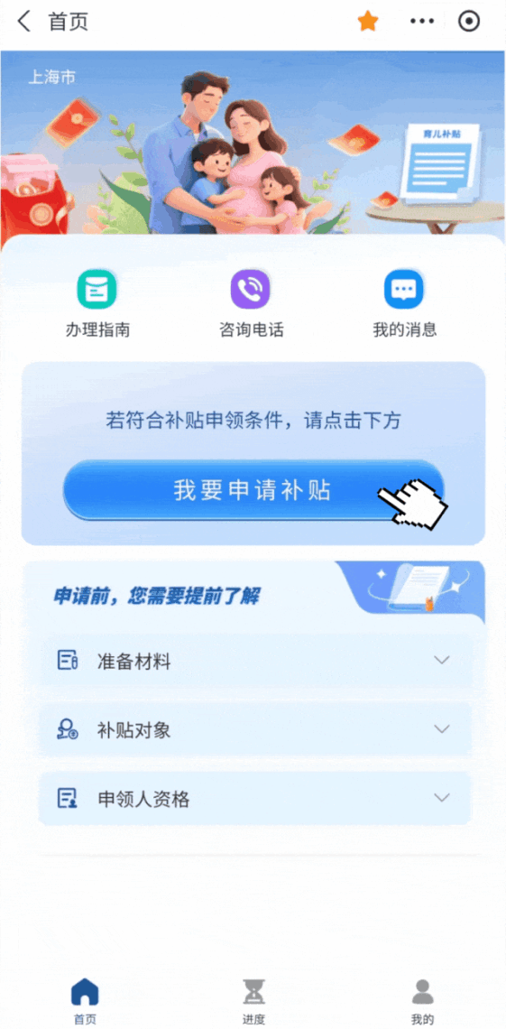 1.打开“随申办市民云”(APP/微信小程序/支付宝小程序),首页点击“育儿补贴专区”前往申领。