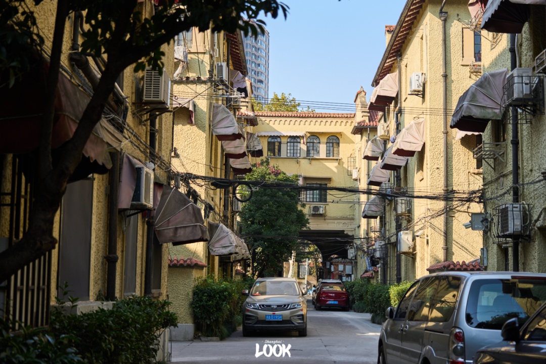 走进涌泉坊,弄堂内部的建筑外部风格都是非常统一的,整体呈现出现代主义风格的简洁,细节上采用了大量的西班牙建筑元素,比如窗户外的红色“小帐篷”。
