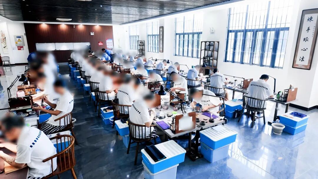 面对将罪犯改造为守法公民的核心使命,监狱选择以国家非遗——紫砂陶技艺为载体,深化探索“产学业一体化”路径。这不仅是非遗技能、谋生手段的传授,更是一场深刻的法治教育矫治实践。监狱“澄心工作室”应运而生——秉持“涤壶澄心、静心澄澈、澄炼罪错、诚意正心”理念。项目旨在把《监狱法》中“惩罚与改造相结合”原则,转化为一道道具体的工序、一条条明晰的标准,让罪犯在学习制壶技艺全过程,体会规则的意义、责任的分量。