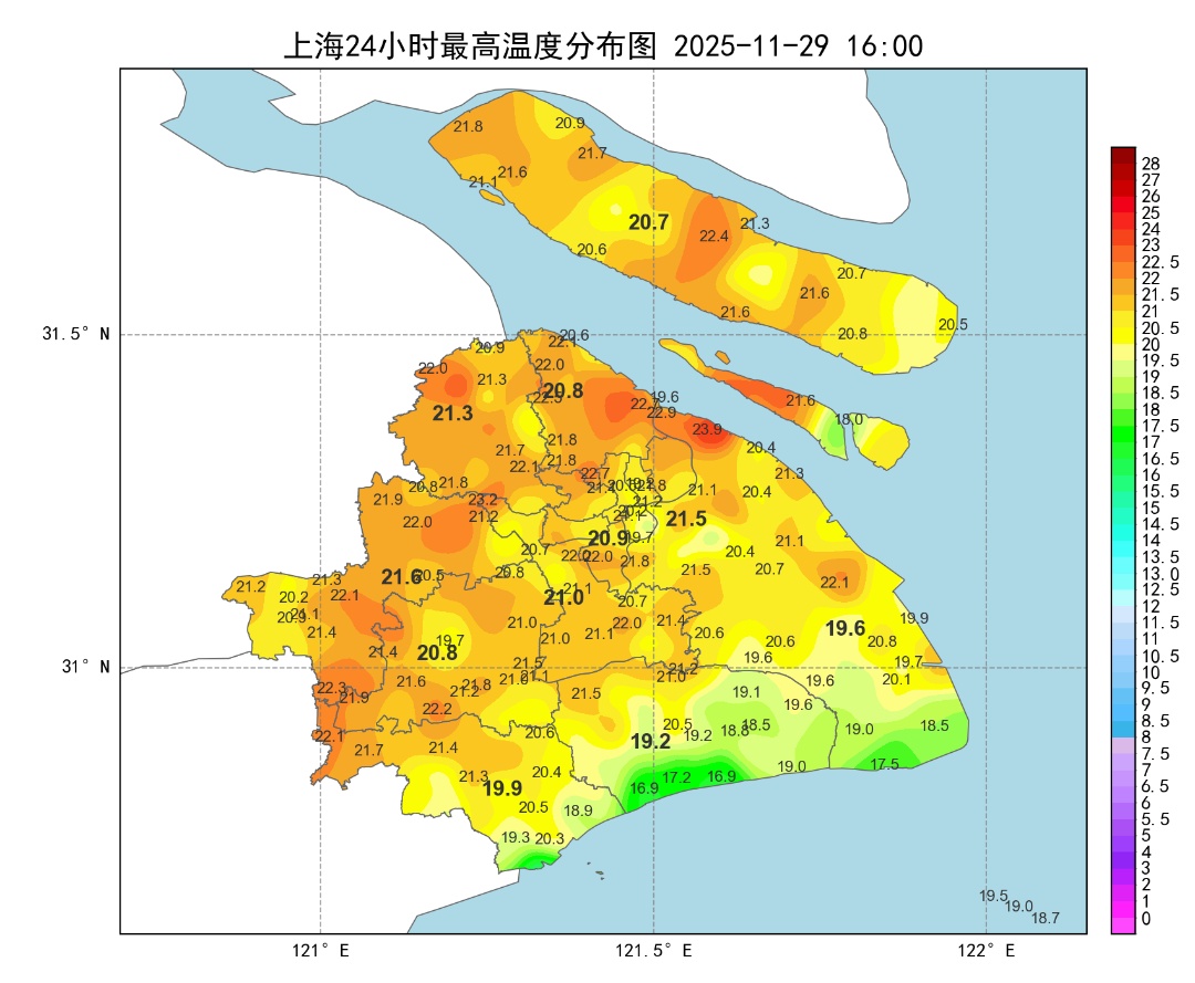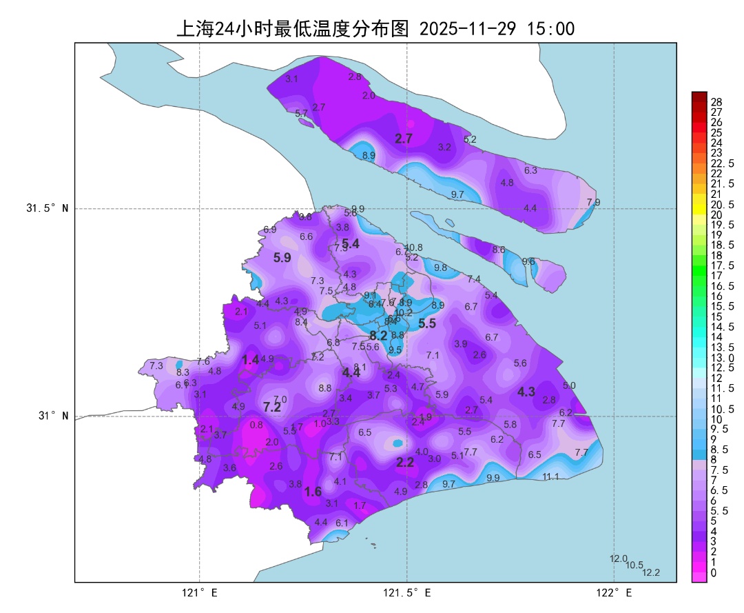 受辐射降温影响,申城今晨最低气温城郊差异明显,青浦站1.4℃为最低,徐家汇站最低8.2℃,早间体感偏冷。白天天气晴好,空气干燥,暖阳相伴下,午后全市最高气温多在20、21℃上下,其中徐家汇站20.9℃,白天体感偏暖。