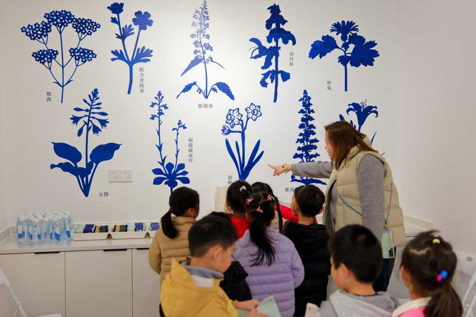 开馆展选取了今年4月,志愿者在“大自然保护植物共建区”中开展补种行动的主题图片。左右两片展墙上,既有志愿者辛勤劳动的照片,也有他们种下的多彩植物。进门的那面展墙,则是艺术家陈静与上房园林植物研究所合作绘制的十种长三角原生植物剪影图,它们以丝网印刷的方式共同构成一片“艺术花圃”。