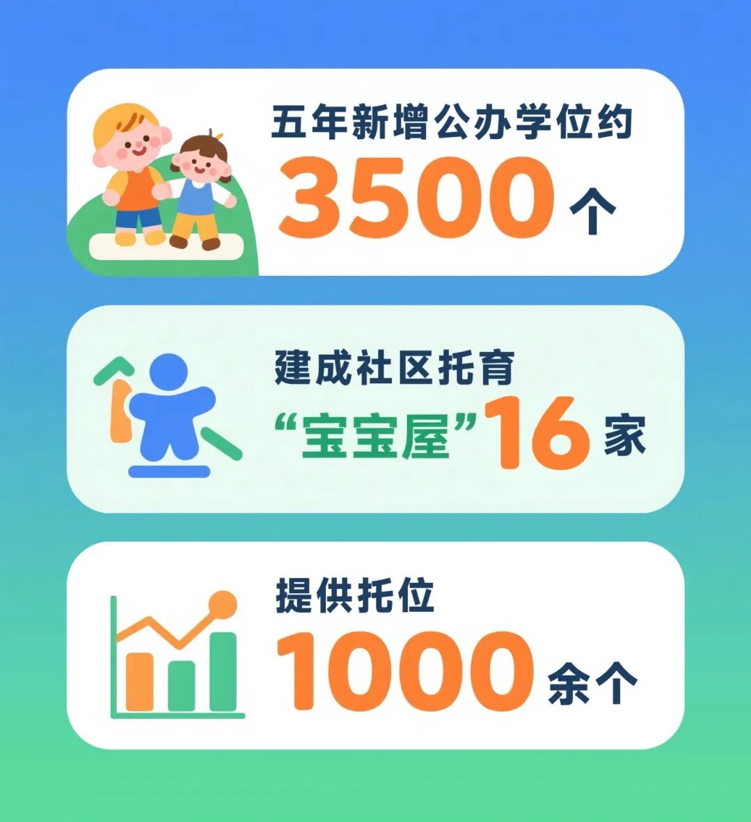 五年新增公办学位约3500个,建成社区托育“宝宝屋”16家,提供托位1000余个。