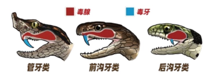 蛇类中毒蛇相对比较独特,它们通常具有毒牙,有独特的毒液输送机制,最终由毒牙排出。有毒牙的蛇一般分为三大类,即管牙类、前沟牙类和后沟牙类。