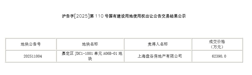 日前,区规划资源局发布沪告字【2025】第110号国有建设用地使用权出让公告交易结果公示,嘉定区JDC1-1001单元A06B-01地块由上海盘古房地产有限公司竞得,成交价62390万元,详见↓