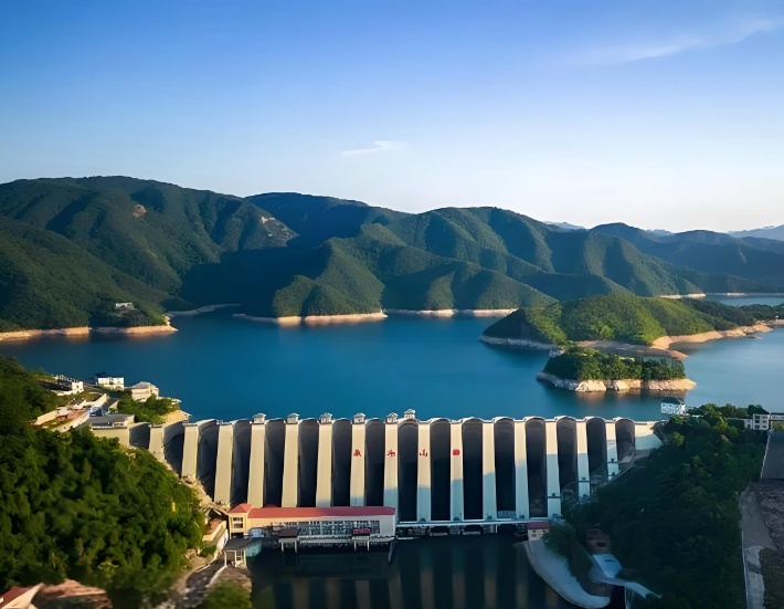 位于六安市金寨县西南端的梅山水库,水域辽阔,水质清澈,与四周连绵的群山、茂密的森林交相辉映,构成层次丰富、气势恢宏的山水景观。