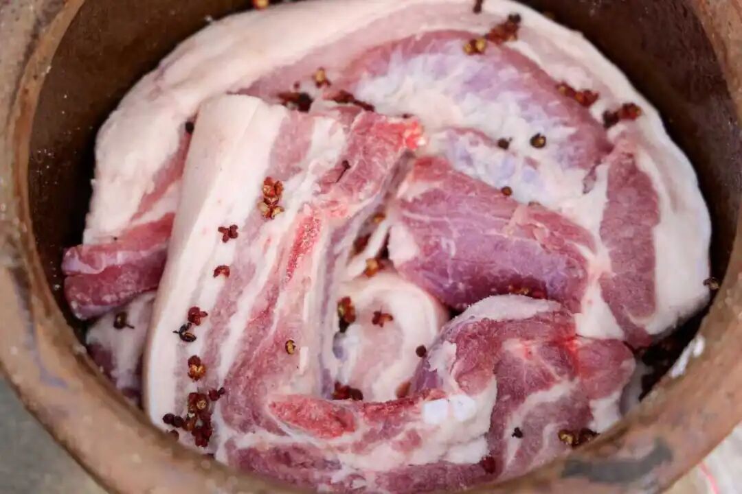 在朱泾镇万联村,谢桂芳阿姨一只手拿着切得匀称的长条五花肉,一只手仔细地将盐和花椒均匀涂抹在猪肉的每一个部位。“肉要切成条再腌,这样更入味,更好吃。”谢阿姨一边翻动肉条一边介绍,腌制咸肉最好选择三层分明的五花肉,肥瘦相间的比例刚刚好,这样腌出来的肉既有油脂的醇香,又有瘦肉的紧实口感。