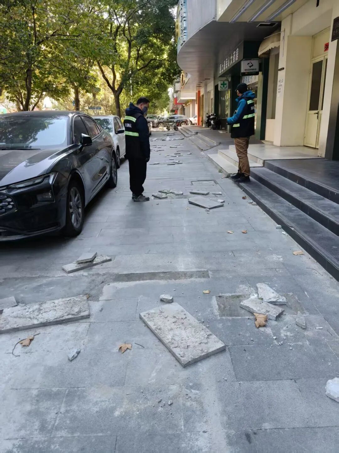 商户集资请来施工队,职能部门现场指导,物业协助清理,路面恢复平整如新。