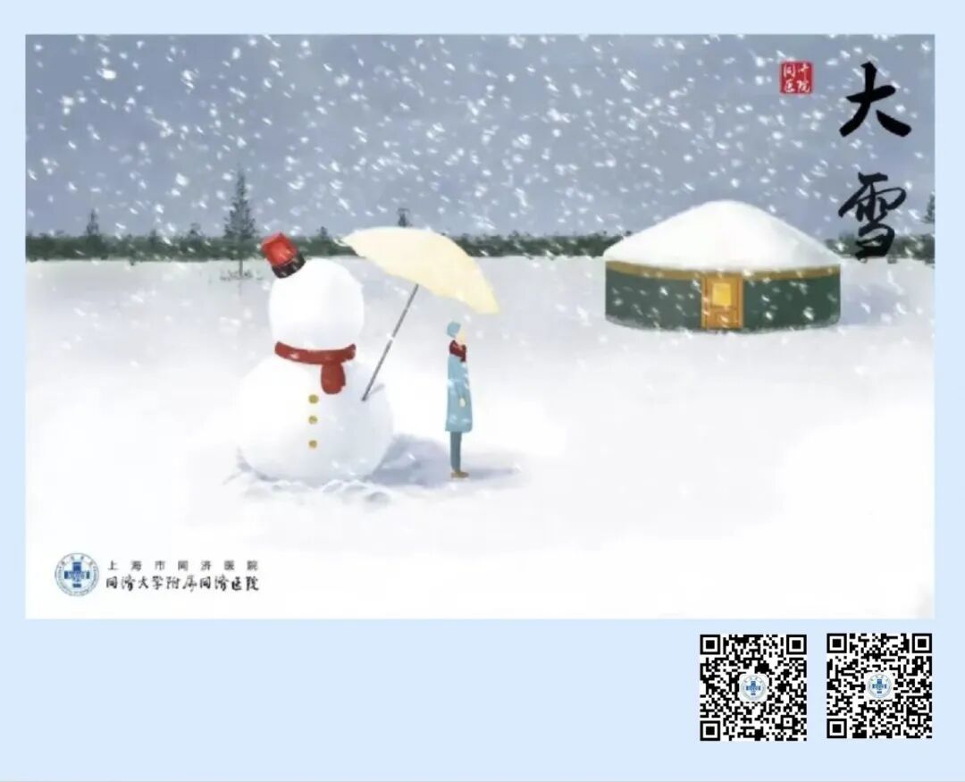 大雪,是二十四节气中的第21个节气,标志着仲冬时节的正式开始。此时,气温显著下降,降雪的可能性比小雪时更大了。大雪时节,常常是寒风凛冽,低温干燥。这样的气候条件下,人们更要注意保暖防寒,以防受寒感冒。同济大学附属同济医院提醒您,大雪已至,让我们顺应时节,遵循传统习俗,做好养生保健,以温暖、健康的姿态迎接冬日的美好。