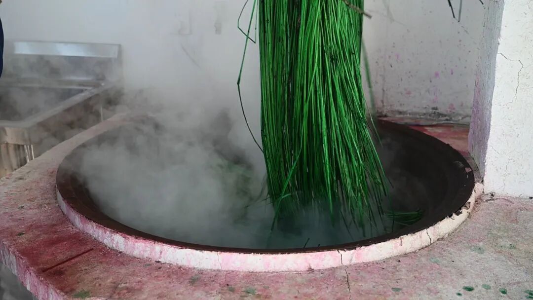 今年73岁的平秀娟,从事黄草染色已50余载,是徐行镇公认的“染色高手”,有一手祖传的好手艺。只见她站在一口直径1米的大锅前,等水煮沸后,熟练地添入染料、黄草,用铁棒搅动。一时间,雾气弥漫开来,再抬头,平秀娟已经挑起一捆染好的黄草,将它重重地摔在地上冷却。村民们见状,熟练地围过来认领自己的黄草。