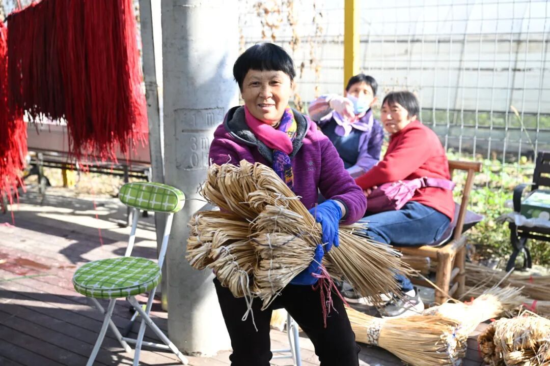 平秀娟一边染着黄草,一边和大家聊天。她加染料全凭感觉,多年的经验尽在其中,徐行草编非遗项目代表性传承人王勤则带着团队在一旁协助学习。“如果黄草要染深色,需加些白酒和明矾起到固色作用……”平秀娟边做边教,倾囊相授。
